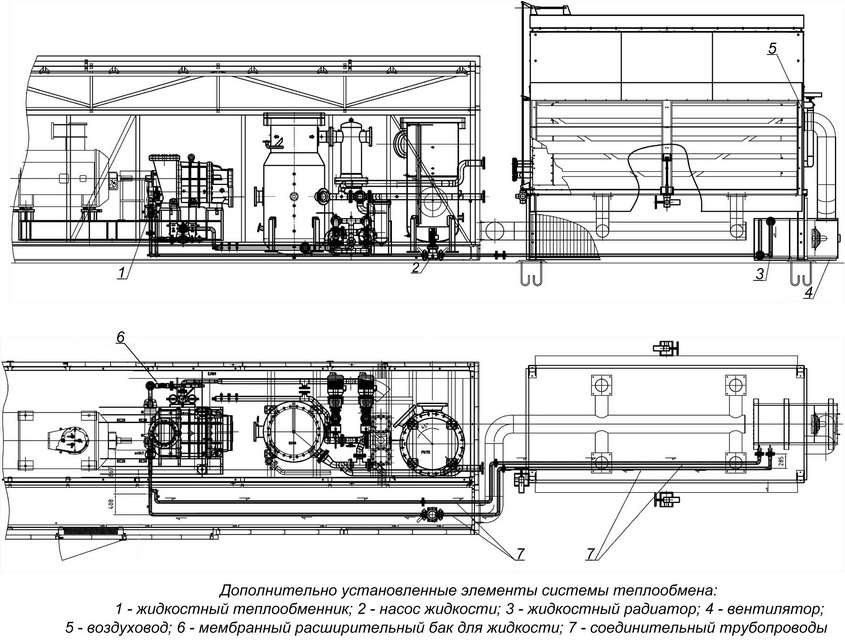 С этой целью установили дополнительные элементы системы теплообмена (см. рисунок ниже): жидкостной теплообменник в маслобаке; насос циркуляции жидкости; жидкостной радиатор для обогрева АВО; вентилятор принудительной циркуляции воздуха; воздуховод; мембранный расширительный бак для жидкости; соединительные трубопроводы; приборы КИПиА.