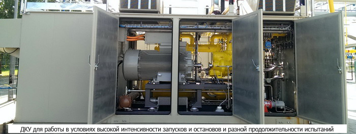 Оборудование разработано по специальному проекту, предназначено для работы в условиях высокой интенсивности запусков и остановов и разной продолжительности испытаний. Производительность ДКУ составляет 6500 м3/ч.